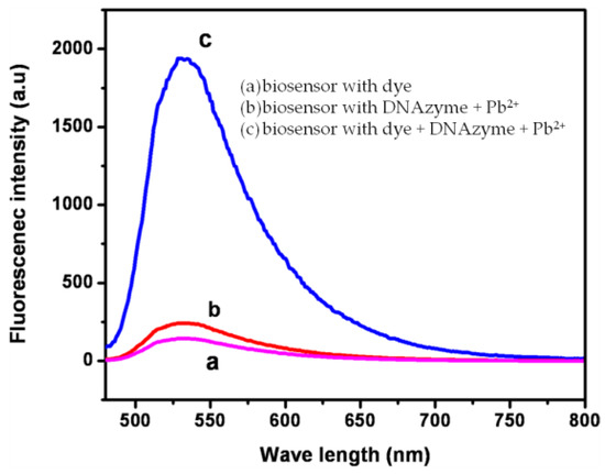 Fluorescence emission spectra obtained with the biosensor with the dye (curve a), with the DNAzyme and Pb2+ (curve b), and with the dye, DNAzyme/carboxylated magnetic beads, and Pb2+ (curve c); λex = 490 nm and λem = 530 nm (Reprinted from [52] with kind permission from Springer).
