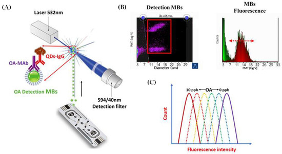 (A) working principle of fluorescence immunosensor for the detection of okadaic acid; (B) draw gate for the detection of magnetic beads and measure the fluorescence intensity; and (C) typical fluorescence intensity curves of fluorescent immunosensor under different okadaic acid concentrations. OA: okadaic acid; MBs: magnetic beads; MAb: monoclonal antibodies; QDs-IgG: quantum dots labelled with secondary antibodies IgG (© 2017, Pan et al. [63]. Originally published in “A novel quantum dot fluorescence immunosensor based on magnetic beads and portable flow cytometry for detection of okadaic acid” under Creative Commons 4.0 license).