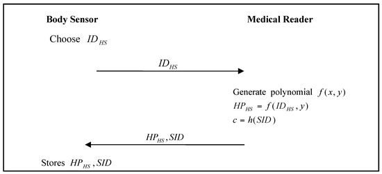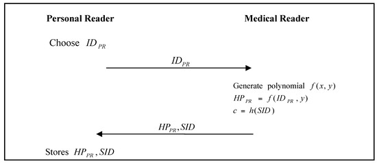 - All personal readers and body sensors must register with medical readers through a secure channel. The personal reader and body sensor send their IDs (e.g., UUID) to the medical reader. The medical reader returns information that includes parameters calculated by lightweight polynomial function.