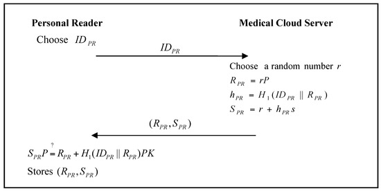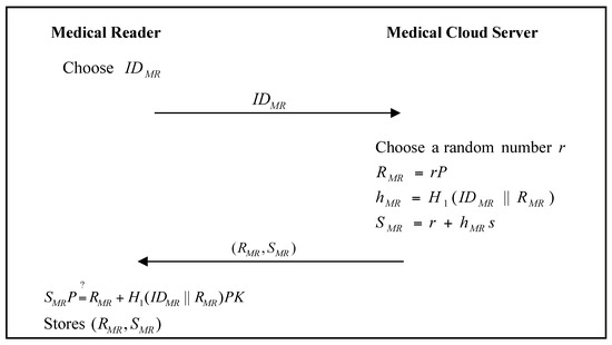 The medical reader must register with the medical cloud server. In the proposed scheme, the personal reader and the medical reader can authenticate each other directly without connecting to the medical cloud server. The medical-reader registration phase of the proposed scheme is shown in Figure 8.