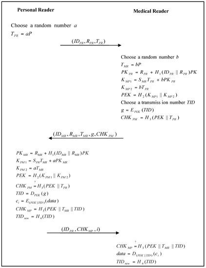 - The medical reader verifies:to check the legality of the personal reader. If it passes the verification, the session key between the personal reader and the medical reader is established successfully. The medical reader calculates:and also updates the transmission number to by:for future communication.