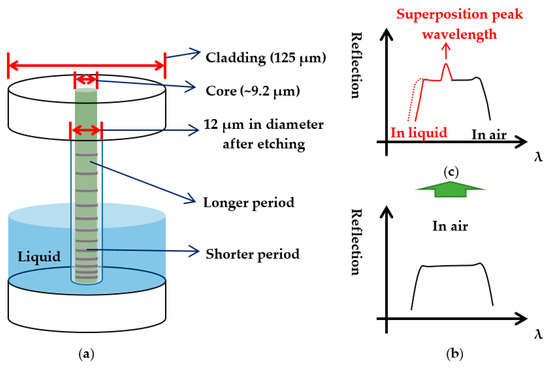 (a) Illustration of the etched chirped fiber grating and the sensing principle; (b) Illustration of reflection spectrum of the etched CFBG in air; and (c) the shorter period part of the grating immersed in liquid.