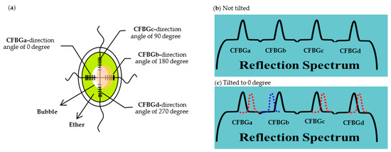 In this study, two etched CFBGs arrays are cross-wisely installed in a plate-shaped container as the sensing elements of the inclinometer as shown in Figure 2a. Each fiber has two inscribed CFBGs. The length of each chirped fiber grating is 7 mm. The separation between two chirped fiber gratings is 6 mm with the longer period part facing the center of the sensor. Diethyl-ether (ethoxyethane, or simply ether) and an air bubble are filled in the container. The inner diameter of the plate is 20 mm and the diameter of the bubble is 10 mm. Therefore, the air-liquid boundaries of the bubble are located at the middle of the CFBGs as shown in Figure 2. The structure is similar to a typical level meter. To avoid saturation of the superposition of the peaks, the reflectivity of the CFBGs is designed as 40%. The tilt angle and direction can thus be monitored through the peak wavelength shifts of the four CFBGs. Figure 2b,c illustrate the relative change of the superposition peaks at different situations. When the sensor is not tilted, the four peaks are located at their center positions as shown in Figure 2b. When the sensor is tilted to 0°, due to the movement of the air bubble, as illustrated in Figure 2a, for CFBGa, the liquid-air boundary shifts to the longer period grating side, which results in a red shift for the peak of CFBGa. Similarly, for CFBGb, the liquid-air boundary shifts to the shorter part and results in blue shift of the peak. For CFBGc and CFBGd, due to the movement of the air bubble, the liquid-air boundaries both move to the longer period part and cause the peaks to redshift, but not as much as CFBGa.