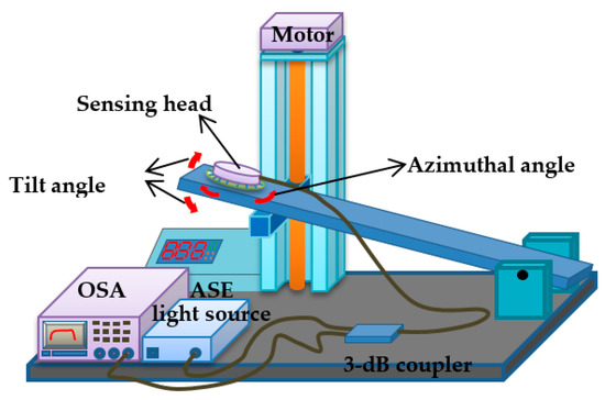 The setup that we used to evaluate the proposed two-dimensional fiber-optic inclinometer is illustrated in Figure 3. The tilt angle is controlled by slanting the electrical platform. The tilting direction (directional angle) was controlled by rotating the azimuthal angle of the sensor head. The range of tilt angle was controlled between 0° and 2.5°, and the range of directional angle was from 0 to 360°. Two etched CFBG arrays were connected to the optical spectrum analyzer (OSA, Q8384, Advantest Corp., Tokyo, Japan) and a wide-band amplified-spontaneous-emission (ASE, FL7002, Thorlabs Corp., Newton, NJ, USA) light source through a 3-dB coupler for real-time spectrum analysis. The acquired spectra by the OSA were sent to a computer for further analysis.