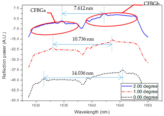 Reflection spectra of the CFBGa and CFBGb array at 0, 1, and 2° tilt angles at the directional angle of 0°. The spectra are shifted in the y-axis for presentation. The double-sided arrows indicate the separation between the superposition peaks of CFBGa and CFBGb.