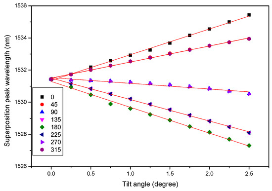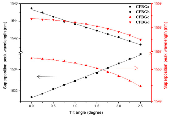 In order to understand how the superposition peaks of the four CFBGs shift as the sensor tilts, we plot the relations between the peak wavelengths and the tilt angles, as shown in Figure 6. The tilt direction is 0° for this plot. The points for CFBGa and CFBGb are labeled in black and the points for CFBGc and CFBGd are red. The two CFBG arrays are inscribed at distinct wavelength ranges for easier reading. In order to put the data points from the two CFBG arrays on the same plot to illustrate the shifts of the peaks as the sensor tilt, we overlapped the distinct wavelength ranges in Figure 6. The black labels are referred to the ordinate on the left, while the red ones are referred to the right ordinate. As seen in the figure, as the tilt angle increases, only the peak wavelength of CFBGa increases accordingly, while the other three CFBGs decrease with different tendencies. CFBGa and CFBGb have the same amount of wavelength shifts, but with different signs. CFBGc and CFBGd do not have a linear relationship between the peak wavelength change and the tilt angle. This is because the peak wavelength variation is due to the air-liquid boundary movement along the grating. The change of the peak wavelength for CFBGc and CFBGd is due to the shape of the circular circumference of the air bubble as shown in Figure 2. The two CFBG arrays are crisscrossed, placed in the container with each CFBG separated by 90°. The reason for similar wavelength shifts, but toward opposite sides for CFBGa and CFBGb, is because they are connected in series and the chirping is symmetric with a longer period connected to each other. When the sensor is tilted to 0°, the air bubble moves toward the direction of 180° and the amount of the liquid level change on CFBGa and CFBGb are the same. As the air bubble moves, the CFBGa immerses more into the liquid, which causes the superposition peak to shift toward the longer side. In contrast, as the bubble moved toward CFBGb, less grating is immersed in the liquid, resulting in the opposite peak shift. On the other hand, the relation between the superposition peak wavelength shift and the tilt angle is a parabolic line for CFBGc and CFBGd. This is due to the circular circumference of the air bubble as it moves along the gratings. The distinct tendencies among the gratings make it straightforward for us to determine the tilt direction.