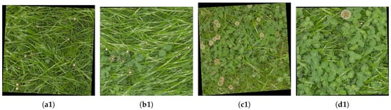 Visualization of annotated image samples. Top row shows four samples with different clover contents. Bottom row shows crops of the images from the top row to illustrate the image resolution. The black pixels surrounding the image samples mark the border of the harvested samples. When the orientation of the camera does not align perfectly with the harvested patch, the image sample appears to be rotated. (a1) 5% clover; (b1) 20% clover; (c1) 50% clover; (d1) 70% clover; (a2) Annotated image patch of (a1); (b2) Annotated image patch of (b1); (c2) Annotated image patch of (c1); (d2) Annotated image patch of (d1).