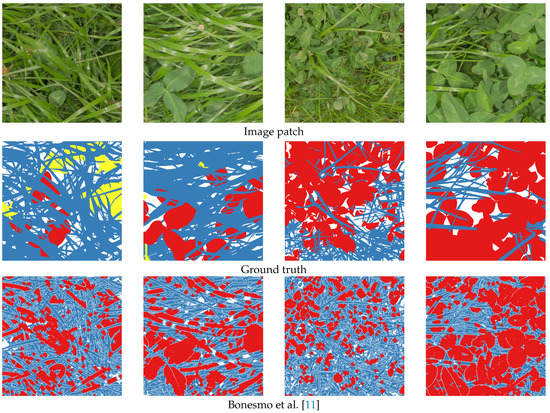 Researchers have previously sought to estimate the content of clover-grass in images. Bonesmo et al. [11] developed an image processing software program for pixel-wise classification of clover-grass images. The program used color indexes, edge detection, and morphological operations on the color images to distinguish and quantify the amount of soil, grass, clover, and large weeds. The software estimations and the manually-labeled clover coverage showed a high correlation (r2 = 0.81).