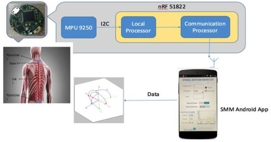 The material requirement of this research is a pair of IMU sensors to create a network of joints and links that can mimic a three-dimensional (3-D) robot model of a portion of the human trunk. The wireless motion sensor developed in this study uses a nine-axis motion processor from InvenSense (MPU9250, InvenSense, San Jose, CA, USA) and a system-on-chip (SoC) from Nordic Semiconductor (nRF51822, Nordic Semiconductor, Oslo, Norway). Each wearable sensor node (3 cm in diameter and 0.2 cm thick) is wirelessly connected to an Android application (Figure 1). Biocompatible adhesive tapes are used to accurately secure these sensors in the designated areas in the trunk. An Android device acts as host receiver to the data transmitted by these sensors [10]. The Android device must be Bluetooth 4.0 enabled and must have the data collection or sensor configuring host application installed to allow collection of data in the receiver [10]. A MATLAB program was developed for required mathematical calculations.