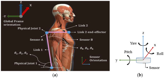 Sensor placement: (a) Shows location of joints of robot model along with placement of sensors. Both the physical joints are imaginary. Physical Joint I is located at the hip (hip joint), and Physical Joint II is located on the back (posterior side), just below the neck. Each physical joint has 3-DOF (degree-of-freedom) (three joints are combined to form each Physical Joint) imparting the robot system a total of 6-DOF. Links 1 and 2 are also imaginary and connect Physical Joint I to Physical Joint II, and Physical Joint II to Link 2 end-effector, respectively. Sensor A is placed at the end of Link 1 just before the Physical Joint II and, thus, it gives the orientation of Link 1 with respect to the global frame. Sensor B is placed at the end of Link 2 just before the Link 2 end-effector, and it gives the orientation of Link 2 with respect to the global frame. are the angles that Link 1 makes with the base frame (Frame 0) of the robot model that will be introduced ahead. are the angles that Link 2 makes with Link 1 and are found to provide the respiratory information; (b) The orientation of both sensors: ‘Roll’ is the rotation around “x-axis,” “pitch” around “y-axis” and “yaw” around “z-axis” of the sensor coordinates. All rotations follow anticlockwise-positive convention.
