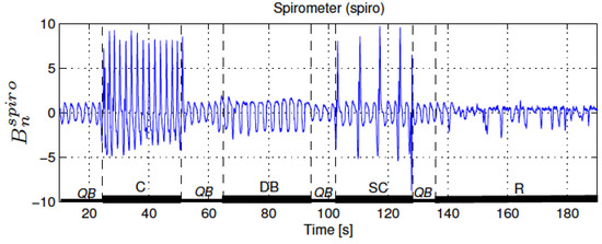 This section provides a discussion of the experimental results obtained in this research. Figure 4 presents a reference measurement of the respiratory activity; the airflow at the mouth and nose was measured using a spirometer that is a standard instrumentation for respiratory monitoring.
