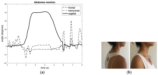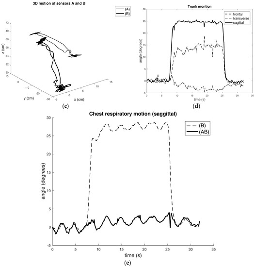 (a) Normal breathing accompanied by bending-extending trunk-motion: It was measured using single IMU (inertial measurement unit) located on the abdomen. The abdomen joint angle shows bending motion of trunk in the “Sagittal” plane. Other abdomen angles have minimum deviations showing some noisy breathing signals. The sensor motions show the trunk motion has been reflected in the precision of the respiration signals. (b) The pictures show the two IMU sensor placements on the trunk in coherence with that shown in Figure 2a. (c) The 3-D Cartesian motions of sensors A and B: The sensor motions clearly show the bending motion has been reflected in the graph. (d) Normal breathing accompanied by bending-extending trunk-motion: The hip joint angles show bending motion of trunk in the “Sagittal” plane. Some of the bending trunk motion has been reflected in the “Transverse” plane. The hip joint in the “Frontal” plane shows negligible deviation, as this experiment did not involve bending motion. (e) Normal breathing accompanied by bending-extending trunk-motion: The breathing signals and the “Sagittal” motions of sensors A and B: The “Sagittal” plane motion of sensor B shows some breathing signals with a significant bending motions. The very clear breathing motions of ribcage joint angles from sensors A and B (decomposed chest motion with respect to dorsal chest position) in the “Sagittal” plane. Sensor B signals show bend-extend motion (downward-upward deviation, respectively).