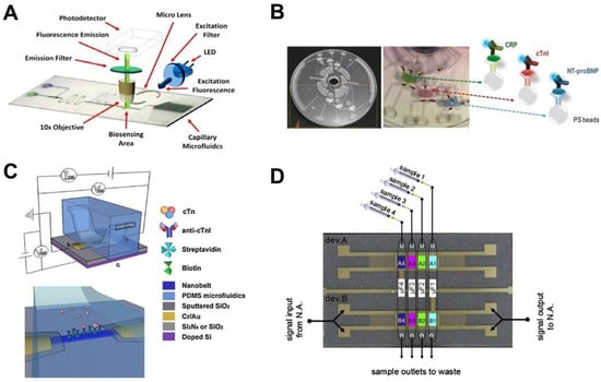 Examples of LoC-based platforms for CVD biomarker detection. (A) An autonomous capillary microfluidic platform with embedded optics for troponin I detection []; (B) a lab-on-a-disc platform for fully integrated multiplex cardiac marker immunoassays []; (C) functionalized SnO2 nanobelt field-effect transistor sensors for label-free detection of cardiac troponin []; (D) detection of multiple cardiac markers with an integrated acoustic platform for cardiovascular risk assessment []. Figure A is reprinted from Mohammed et al., Autonomous capillary microfluidic system with embedded optics for improved troponin I cardiac biomarker detection, Biosens. Bioelectron., 61, 478–484, Copyright (2014), with permission from Elsevier; Figure B is reprinted with permission from Park et al., Lab-on-a-Disc for Fully Integrated Multiplex Immunoassays. Anal. Chem. 2012, 84, (5), 2133–2140. Copyright (2012) American Chemical Society; Figure C is reprinted from Cheng et al., Functionalized SnO2 nanobelt field-effect transistor sensors for label-free detection of cardiac troponin, Biosens. Bioelectron., 26, 4538–4544, Copyright (2011), with permission from Elsevier; Figure D is reprinted from Mitsakakis et al., Detection of multiple cardiac markers with an integrated acoustic platform for cardiovascular risk assessment, Anal. Chim. Acta, 699, 1–5, Copyright (2011), with permission from Elsevier.
