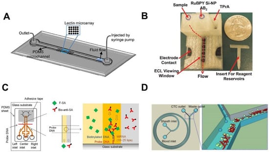 Protein biomarkers are important targets for early cancer detection and monitoring [,]. Particularly, a multiplexed test of a panel of protein biomarkers can improve the outcome of cancer diagnosis [,,]. In this direction, Shadfan et al. configured a multiplex microfluidic platform to quantify multi-biomarkers for ovarian cancer detection []. The device was assembled with multiple double-sided adhesive and polyethylene layers, which were cut into fluidic channels. Agarose beads conjugated with capture antibodies were trapped in the channel to perform the sandwich immunoassays. Individual components such as membranes, glass fiber conjugate pads and mixers were integrated into the device to enable on-chip sample filtration, antibody storage, and chemical mixing. Four biomarkers with significant relevance to ovarian cancer including carbohydrate antigen 125 (CA125), human epididymis protein 4 (HE4), matrix metalloproteinase-7 (MMP-7) and Cancer Antigen 72-4 (CA72-4) were tested with this device using serum and plasma samples. This device was able to distinguish the patients encompassing early- and late-stage ovarian cancers from healthy controls with 68.7% sensitivity at 80% specificity. Glycosylation pattern changes in serum proteins and membrane proteins of tumor cells are closely associated with cancer progression [,,]. The traditional technologies for glycocodes characterization such as chromatography and mass spectroscopy are limited in throughput and the ability to systematically evaluate the protein glycosylation pattern []. Roy et al. fabricated a microfluidic device with a microarray of 17 different lectins on the bottom surface of the channel to study the glycan structure alteration in different stages of gastritis and gastric cancer with high-throughput and low sample volume (Figure 3A) []. Using this platform, serum and gastric biopsy samples from normal and different type of gastritis and gastric adenocarcinoma patients were tested. Characteristic glycol-profiles were identified in the patient group but not the healthy control group. Kadimisetty et al. developed a 3D-printed microfluidic electrochemiluminescent (ECL) assay to detect multiple protein biomarkers for prostate cancer (Figure 3B) []. The device included a microfluidic channel with 3D printed reaction array, reagent reservoirs and washing reservoir module. The protein biomarkers were captured by the antibody-coated carbon sensor. This was followed by reaction with the Ru(bpy)32+ (RuBPY)-doped silica nanoparticles coated with the detection-antibody in a sandwich immunoassay. The ECL signal from the electrochemical oxidation of RuBPY was captured with a CCD camera to evaluate the protein concentration. Three cancer biomarkers including prostate specific antigen (PSA), prostate specific membrane antigen (PSMA) and platelet factor-4 (PF-4) were tested and the LOD was determined to be 300–500 fg/mL in undiluted calf serum. Six prostate cancer patients’ serum samples were tested and results showed good correlation with conventional ELISA.