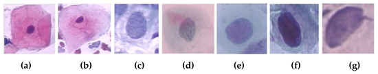 A single cell cervical smear image: (a) superficial squamous, (b) intermediate squamous, (c) columnar, (d) mild dysplasia, (e) moderate dysplasia, (f) severe dysplasia, (g) carcinoma in situ [2,9,10,11,12,13].