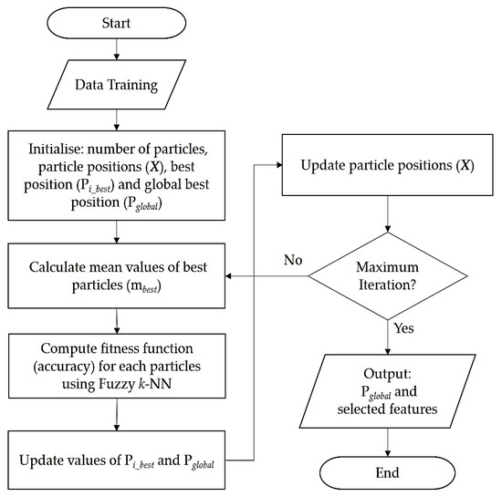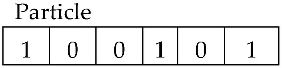 As outlined in the pseudocode, each particle is encoded into a binary string whose length is equal to the size of feature vector. A value of ‘1’ indicates that a feature is selected, whereas a value of ‘0’ indicates otherwise. In this manner, each particle is encoded into a binary string as presented in Equation (8) and further depicted in Figure 2 [19].