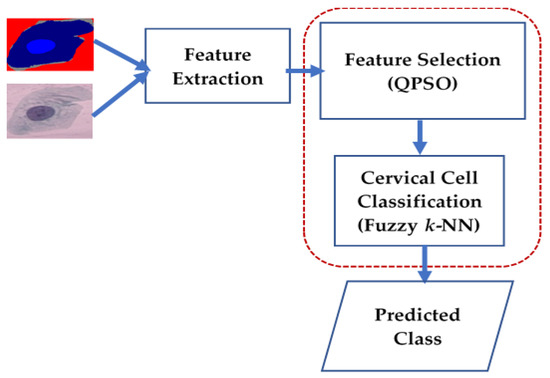 As outlined (in the red short-dashed rectangle) in Figure 3, the feature selection stage of our proposed QHT technique comprises of two units that utilise the quantum-behaved PSO technique and the Fuzzy k-NN algorithm so that both feature selection and classification accuracy in smeared cervical images are enhanced.