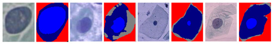 Knowledge of these cell attributes allows us to describe cells in cancerous and precancerous stages since they are marked by many changes in morphology and architecture, including geometry (in terms of both shape and size) of the cytoplasm and nucleus, changes in nuclear-cytoplasm ratios, and others [15,16,17]. Some sample results for Pap smear image tests are shown in Figure 1.