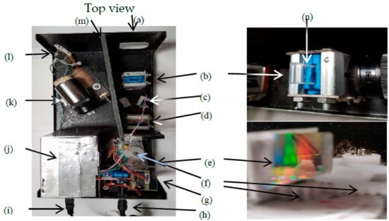 Device 2 components: (a) light entrance; (b,d) slits on the two sides of each unit; (c) sensor 1; (e) grating and its close view; (f) gears are used to increase the scanning steps, one gear is attached to the grating; (g) 5 V regulator circuit supply energy for other electronics units inside the device 2, and the driver circuit using ULN2003 IC controls the stepper motor; (h) power supply input; (i) digital data output; (j) metal box protects inner circuits from external noise; (k) sensor housing; (l) amplifier circuits are combined two low-pass filters which filter out noise greater than 50 Hz; (m) wall protects the sensor 2 area from the light entrance area; (n) sample cuvette.