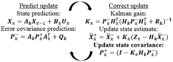 Details of the Kalman algorithm can be found in [23,25,26], but it is necessary to focus on some Equations and quantities of the theory for later applying explanation. First, the system is supposed to be linear [26,27], so its state equation has the form: