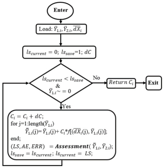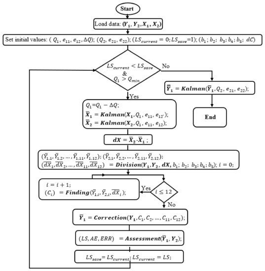 The data subdomain of order i, , are loaded. In this process, and are also the least square values to serve for operating the loop. When < and is different with null, is increased by a dC. < condition means the current corrected sub data is better the previous corrected data, so this sub data still can be better amended. Then, the suggested correction function is applied to fix and returns . Next, the subprogram will call the Assessment function to calculate LS, AE, ERR based on Equation (5), the corrected data, , and reference data, , and updates with , and with LS. Then, the subprogram keeps going back to the operating condition until > which means the current corrected data cannot be further corrected. From the flowchart in Figure 4, the finding module are called twelve times to access all the subdomains without noting of whether they are null or not.