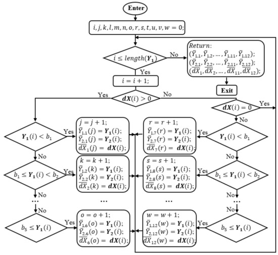 In this function, there are thirteen indexes, i, j, k, l, m, n, o, r, s, t, u, v, w to address data points in the vector , , and . Initially, i is smaller than the number of the data elements of that is checked by the first condition in Figure 5. i is increased one unit and the condition of whether (i) is positive is checked. With either “Yes” or “No”, this first data element, is compared with , , , , and to see to which data subdomain it must belong to. The difference here is that if (i) > 0, the first six subdomains, , , …, for , , , …, for , , …, of , are used for the arrangement. In case (i) < 0, the second six subdomains, , , …, for , , , …, for , , …, of , are used for the assembly. When (i) = 0, the running point will jump back to the first condition. Then, the same procedure is repeated until i, loop index, is larger than the number of the data elements of . Especially, when all vector = 0, the division will return twelve empty subdomains. In this case, there is no need to fix the spectral data. When all > 0, from Figure 5, the left side condition boxes will be conducted. Consequently, the first six subdomains are none-empty, and the second six subdomains are empty. Inversely, when all < 0, the second six subdomains are none-empty, and the first six subdomains are empty.