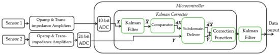 After the simulation step, all necessary key components, correction function, correction coefficients, and process noise covariance are provided and ready to apply in the device and to build the Kalman corrector. Figure 7 illustrates the procedure of collecting and processing data. The light intensity signal from sensor 1 enters the 10-bit ADC and the spectral intensity signal from sensor 2 goes to the 24-bit ADC. These signals are digitalized to become digital data. X is filtered out noises and quantization error by to become . Next, the compare block will calculate dX which , where is a loosely optional value. can be equal to a certain standard value or a measured value which is measured ahead before any spectral measurement. Then, dX and Y values will be delivered by the subdomain deliver to assigned data subdomains which are characterized by , , …, and controlled by dX. Here, the subdomain deliver works similar to the division. It will base on whether dX is positive or negative and to what range among (0, ), [, ), …, [, ), [, Y belongs to. Y is then sent to the correction function which is governing the data subdomain corresponding with that range (Section 2.4.1 and Figure 6). For example, if dX > 0, and 0 < Y < , then Y is sent to the corresponding subdomain, where is governed by a data correction function of founded by the previous simulation, to be thoroughly amended. This is performed in real time, so dX and Y are no longer data vector but rather discrete-time data measured at each discrete time.