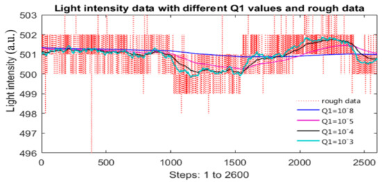 In Figure 8, the red-dot line is the recorded raw 10-bit data of the light intensity source which was slightly adjusted to simulate an unstable light source. Several values of are tested to study the features of . One may see that the smaller the is, the smoother output data from the Kalman function will be. This leads to that , the blue line, is so smooth, when is so small, for example (it is matching with this type of data and measurement error). Thus, not only the electronics noises and quantization error are removed but also some useful and crucial information from the light source. Obviously, this will ruin the data correction and simulation process.