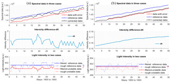 First, in Equations (1), (2), and (4), the values of real data of sensor 1 and sensor 2 were mentioned and known. However, that is only a hypothesis to help establish the processing algorithm. In practice, the values measured in stable conditions are considered approximately equal to the real values and are reference values to serve for comparison and calculation in simulation. The flowchart in Figure 4 shows the core algorithm for the simulation program, where and are spectral data measured in unsteady conditions and good conditions respectively, whereas and are light intensity data recorded in these two cases. Conventionally, and are data with unstable-light-intensity data with error, and and are reference data.