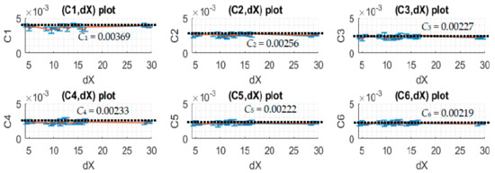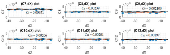 When dX is adjusted to different positive and negative values which correspond to the simulations of different voltage increases and decreases, one can see from the plots of Figure 10 and Figure 11 that Ci and dX relationship is linear as expected and the slope angle is zero. In this case, one can take the mean values of Ci to make it as the correction coefficients of the corresponding subdomains.