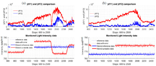 Moreover, the chosen approach should be applicable and feasible for the microcontroller code and satisfies real-time application without any processing lag and procrastination. For feasibility, two outstanding algorithms are the moving average [14] and the Kalman algorithm [23,25,26]. For real-time applications, the Kalman algorithm has been proved by some simple experiments to dominate the moving average algorithm. After being treated by the Kalman algorithm, ideally, dx (dx = ) containing only unstable light-intensity error, which is considered as useful information, will be ready to serve for the correction process.