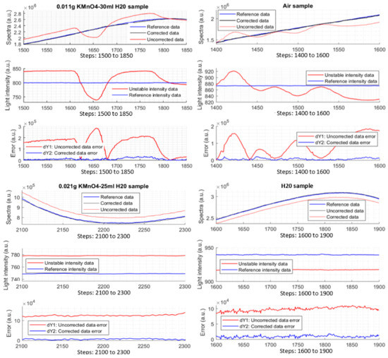 After the simulation testing, the correction function and the parameters are applied into the device for further testing. For the test, the reference data are still required. The light intensity of the light source is adjusted similarly when the data with error were recorded to serve for the above simulations. The difference here is the data with error will be corrected immediately by the corrector module which is coded into the Atmel328P processor. To check the effectiveness and ability of the corrector, several different types of samples are required (air, H2O, and KMnO4 samples) under the light intensity changes in both mono-changing and multi-changing strategies. From experiment data, spectral data, light intensity data, and errors are plotted, Experimental results prove that the corrector module works well as can be seen in Figure 13. Note that there are four types of different samples and three types of plots in the figure to illustrate the work of the corrector. The errors of the data after the correction are also plotted.