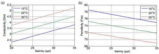 (a) Conductivity of seawater according to salinity; (b) Permittivity of seawater according to salinity.