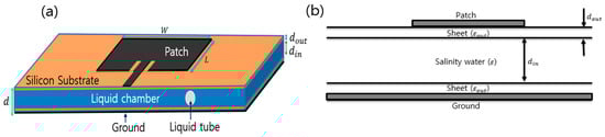 For salinity determination, a microstrip patch antenna is proposed, which is shown in Figure 2a. In the proposed design, both patch and ground plane are placed on the silicon substrates and a liquid chamber is made between the silicon substrates. Consequently, the proposed sensor can detect salinity with better accuracy by examining the resonance frequencies caused by different salinities.