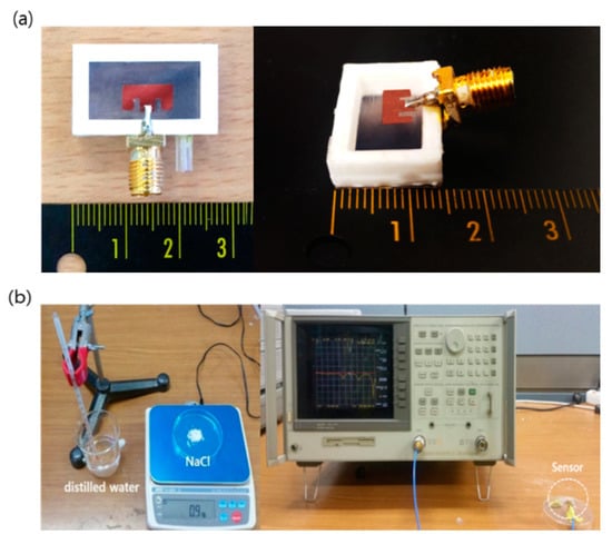 To measure the resonance frequency shift, the fabricated sensor was characterized by using a calibrated Agilent Technology vector network analyzer (VNA) (Agilent Technology, Santa Clara, CA, USA) connected with a 50 Ω transmission line and a 50 Ω RF SubMiniature version A (SMA) connector. (Agilent Technology, Santa Clara, CA, USA). To verify the resonance change to salinity determination, an experiment was performed by adding NaCl to distilled water. The experimental setup is shown in Figure 4b.