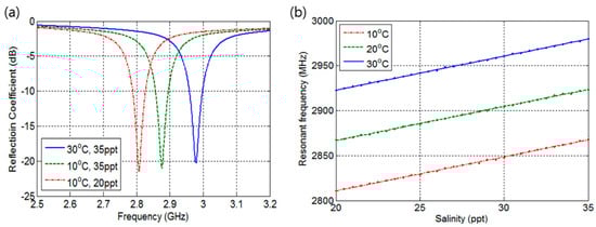 The ANSYS HFSS was utilized for full wave analysis of the proposed sensor design. By sweeping the frequency from 2.5 to 3.2 GHz, the reflection coefficients () according to salinity at fixed temperature were obtained as shown in Figure 5a. The Figure 5a shows the reflection coefficients at resonance frequencies obtained at a salinity of 20 ppt and 35 ppt at temperatures of 10 °C and 30 °C. The reflection coefficients were below −20 dB, which indicates that the load impedance of the design matches well with various seawater conditions. Figure 5b represents resonance frequencies to salinities at temperatures of 10 °C, 20 °C, and 30 °C, which are obtained with 0.5 ppt salinity increment. The blue, green, and red lines are approximated first-order interpolation functions with which the frequency separation—difference between resonance frequencies represented by blue and green or between green and red lines—of 57 MHz and maximum resonance frequency of 2980 MHz were obtained at a temperature of 30 °C. The estimated first-order interpolation function of resonance frequency () can be written as follows: