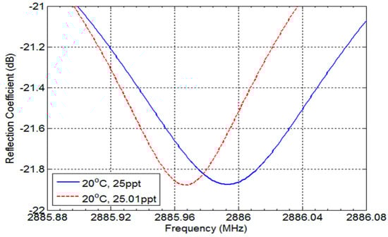 The measured reflection coefficients of the fabricated sensor at temperature of 20 °C in the frequency range of 2.5 to 3 GHz are shown in Figure 9. As shown in Figure 9a, the measured reflection coefficients for different salinities are smaller than or equal to −35 dB. The measured reflection coefficients to salinity with 2.5 ppt increment are shown in Figure 9b, which reveals that the fabricated sensor has approximately 5% fabrication error in L. This small fabrication error results in a 59 MHz frequency separation, which is 2 MHz greater than the simulation. The resonance frequency change to 0.01 ppt is shown in the inset of Figure 9b and shows an average frequency separation of 48 kHz, which is 26.6% better separation than simulation results of 37.9 kHz.