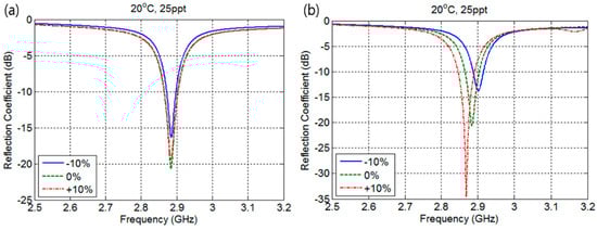 Next, the proposed sensor performance according to fabrication error was analyzed. Fabrication error of is considered in both parameters W and L, which results in and . The reflection coefficient changes according to errors in patch W and L at temperature of 20 °C and salinity of 25 ppt are shown in Figure 7a,b, respectively. The fringing field is formed at the edges of the patch and ground plane in the direction of the microstrip line; therefore, it can be expected that the error in W does not affect resonance frequency, but on radiation efficiency. However, fabrication error in L affects resonance frequency, which shifts to lower frequency with larger values of L and to higher frequency with smaller L. The reflection coefficient becomes 15 dB smaller as error in L increases. Figure 8 represents first-order interpolation functions of resonance frequencies changes to error in L with 0.5 ppt salinity increment. It can be observed that the frequency separation between 20 and 35 ppt salinities remains the same as 57 MHz, whereas MHz frequency bias occurs.