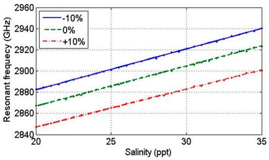 where and represent salinity and temperature, respectively. The interpolation error is 0.38 ppt, which is five times better than commercial salinity determination sensors [,]. Furthermore, the proposed sensor can detect a 0.01 ppt change in salinity by differentiating resonance frequency change with 37.9 kHz resolution. The resonance frequencies at a temperature of 20 °C are shown in Figure 6, which exhibits twice better resolution than sensors in [,].