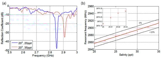 Experimental results: (a) Reflection coefficients of the proposed sensor; (b) Resonant frequency according to salinity.