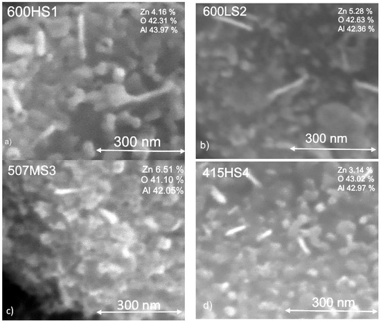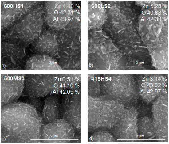 The morphology and composition of the ZnO films obtained under different oxidation conditions were analyzed via SEM and EDX. Figure 2 and Figure 3 summarize these results. When the duration of the thermal treatment applied was equal or higher than 70 min, which is the case of samples 600HS1, 507MS3 and 415HS4, the morphology of the ZnO films consists mainly of pseudo-spherical nanoparticles with a few nanorods. When the duration of the thermal treatment was 10 min (case of samples 600LS2 and 415LS5), the morphology only differs slightly and the presence of some nanodisks was observed, which is indicative that some Zn structures may not be completely oxidized [22,23]. In addition, samples 600HS1, 600LS2 and 415HS4 had structures the features of which were larger than 240 nm, while samples 517MS3 and 415LS5 had in general, structures with sizes under 200 nm. In this regard, when the time of oxidation was larger than two hours or the temperature of oxidation was 600 °C, the resulting structures were larger, in good agreement to previous findings [24]. A higher duration in the thermal treatment resulted in a decrease in the room-temperature electrical conductivity of the samples, indicating an increased oxidation of the original Zn films into ZnO. EDX results indicate that the concentration of Zn was higher in 600LS2, 507MS3 and 415LS5 samples. However, the higher concentration of Zn revealed by EDX is not necessarily related to the presence of a higher amount of ZnO. In fact, the presence of nanodisks observed for samples 600LS2 and 415LS5, seems to indicate the presence of non-oxidized Zn in samples that have not undergone a long thermal treatment. These findings indicate that longer oxidation treatments at higher temperatures induce the occurrence of larger ZnO structures in nanorod and fusiform shapes, similar to those already reported in [23,25].