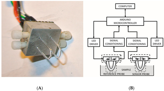 (A) Sensor head with two sensors, the reference and the functionalized with antibody. (B) Schematic diagram of the optoelectronic setup.