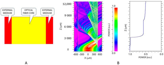 (A) Simulation model of a fiber (in yellow) implemented in BeamPROP with a length of approximately 15 mm and radius of curvature of 5.0 mm and surrounding liquids of different refractive indices (red layer). (B) Light power distribution inside the fiber. The x-axis of the graph on the right represents the total light power in arbitrary units at each section along the z-axis of the fiber.
