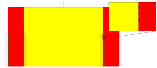 Simulation model of a fiber implemented in BeamPROP in order to simulate a gradual increase of bacteria density (blue rectangles with RI = 1.39) adhered to the fiber surface. The yellow area is the fiber core and the red area the surrounding water.