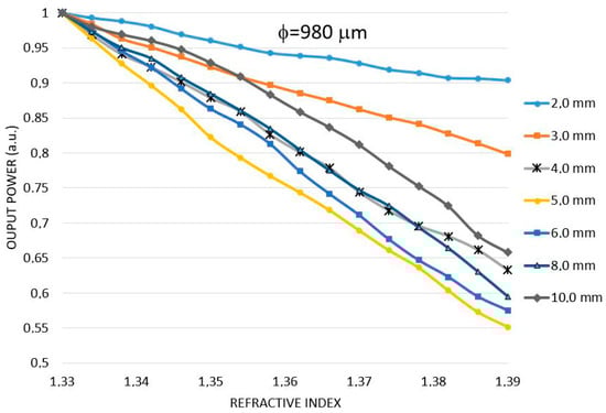 Figure 4 shows the simulation of power output vs. RI for a fiber of 980 µm in diameter and different curvature radii. The vertical axis is the normalized power output and the x-axis is the RI of the surrounding media. It is observed that the variation of the power output, i.e., the sensitivity, is not directly proportional to the radius of curvature. Indeed, for curvature radius between 4.0 and 8.0 mm the sensitivity is about the same. For curvature radius of 2.0 and 3.0 and 10.0 the sensitivity is smaller.