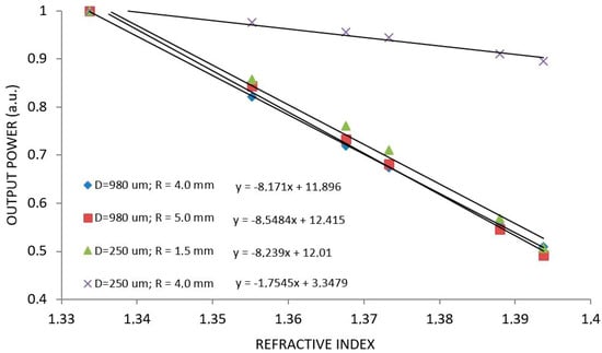 Figure 5 shows RI measurements for two sensors that presented best sensitivities: φ = 980 µm with radius of 4.0 and 5.0 mm and sensor of φ = 250 µm for radius of 1.5 and 4.0 mm. This last radius was simulated just for comparison. Regression equations are shown in Figure 5 whose first term are the experimental sensitivity. Notice that all sensors present about the same sensitivity regardless of the diameter or radius. The exception is the 250 µm sensor with 4.0 mm in curvature that performed similarly to a straight fiber, without losing power along the curvature.