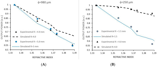 In order to compare simulated and experimental results for RI, we superimposed the two respective graphs. Figure 6A shows a comparison between the simulated and experimental results for RI variations for sensor φ = 980 µm for radius R = 4.0 mm and R = 5.0 mm. Figure 6B shows the comparison between the simulated and experimental results using sensor φ = 250 µm for radius R = 1.5 mm and R = 4.0 mm. By making 10 measurements for each point in the graph, we estimated the uncertainty by the worst value of the standard deviation taken for each group of measurements. The measurement uncertainty is 0.00 RIU (refractive index unit).