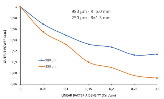 As shown in Section 2.4, a layer with variable bacteria density was added along the fiber to simulate the effect of the sensor when capturing bacteria. To be possible to quantify the number of bacteria present in the fiber surface, we defined a variable called linear bacteria density in cells/µm, meaning the number of cells per unity length of the sensor in micrometers. Notice that, since an Escherichia coli cell measures about 2 µm in length by 1 µm in diameter, a linear density of about 0.5 cell/µm would completely cover the entire length of the sensor. Therefore, we simulated the sensor based on this information, starting from zero up to a bacteria density of 0.30 cell/µm. Figure 7 shows the simulations for a sensor of φ = 980 µm with radius of R = 5.0 mm and for a sensor of φ = 250 µm with R = 1.5 mm, configurations that showed best sensitivities in the analysis above.
