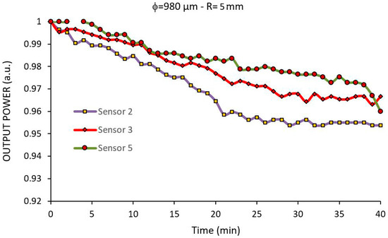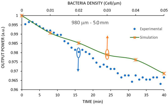 In order to compare simulated and experimental results with bacteria, we first noticed that the experimental results are shown as a time response whereas the simulated results are presented against bacteria density. Therefore, to be possible to compare the experimental results shown in Figure 8 with the simulated results shown in Figure 7, we first notice that the minimum power output reached in the experimental test of Sensor 3 (φ = 980 µm-R = 5.0 mm) is about 0.963 a.u. (see Figure 8). We must now locate this value in the simulated result shown in Figure 7 for this sensor. The best way to do so is by fitting a regression curve on the points of Figure 7, yielding: