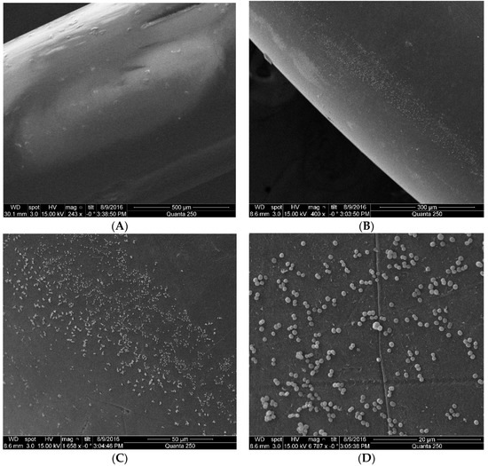 Four pictures with different magnification taken from the sensors under the electron scanning microscope. In (A) the picture shows the reference U-Shaped sensor without functionalization under a scale of 500 μm. In (B) the U-Shaped sensor functionalized in a suspension of 108 CFU/mL of Escherichia coli with a scale of 300 μm. The small dot are the adhered bacteria. (C) Bacteria seen at the sensor surface under a scale of 50 μm. (D) Under a scale of 20 μm, it is possible to notice individual bacteria distributed along the sensor surface. Each bacterium measures about 2 µm in length by 1 µm in diameter.